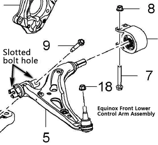 Das Bild oben zeigt die vordere untere Querlenkerbaugruppe für den Chevrolet Equinox. Der Pfeil zeigt die Struktur der offenen Schraubenlöcher innerhalb der Buchsenbaugruppe an.