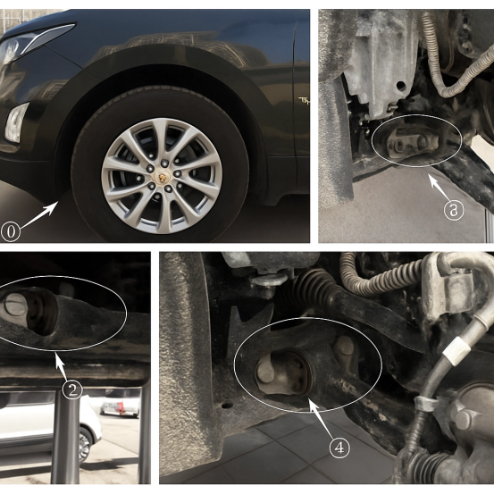 Die vorherigen Fotos veranschaulichen den strukturellen Zustand eines Defekts an der Buchse des Querlenkers der Vorderradaufhängung an einem Chevrolet Equinox. Es weist Benutzer darauf hin, dass, wie in der Abbildung oben gezeigt, die Strukturkomponente mit potenziellem Ausfall überprüft werden kann, indem das Lenkrad in Position ① bis zum Anschlag gedreht wird. Die Sicherheitsüberprüfung der Buchsenbaugruppe sollte anhand von Fotos durchgeführt werden, die an mehreren Stellen, einschließlich der Positionen ②, und ④, aufgenommen wurden.
