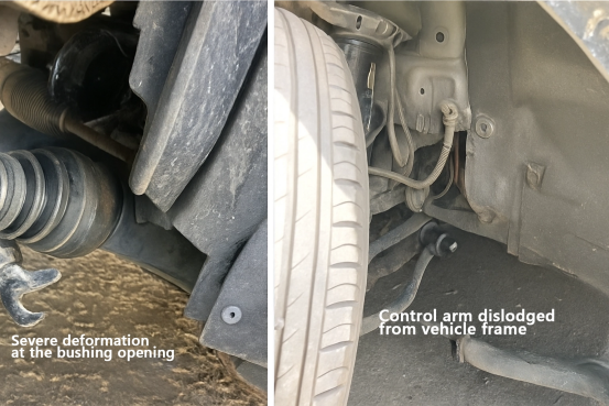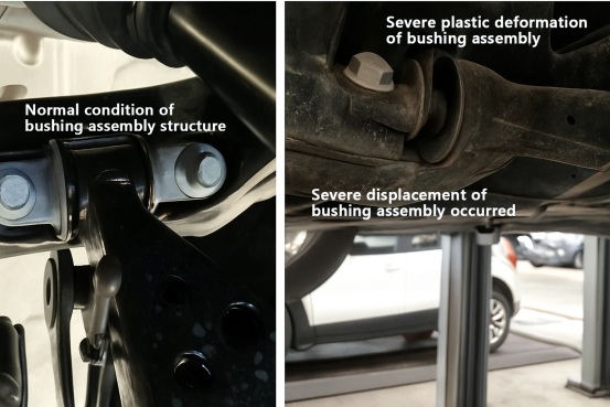Es wird ein Vergleich zwischen einer normal funktionierenden Querlenker-Buchsenbaugruppe (wie im Bild unten links gezeigt) und einer defekten Buchsenbaugruppe (wie im Bild unten rechts gezeigt) durchgeführt. Er weist darauf hin, dass man beim Vergleich der linken und rechten Bilder unten leicht erkennen kann, dass der Spalt in der normalen Querlenkerbuchse auf der linken Seite gleichmäßig ist und es keine offensichtliche Biegung oder Verformung geben sollte, wie im rechten Bild dargestellt. Weist ein Fahrzeug den im rechten Bild dargestellten Zustand auf, stellt es bereits im Betrieb ein Sicherheitsrisiko dar.