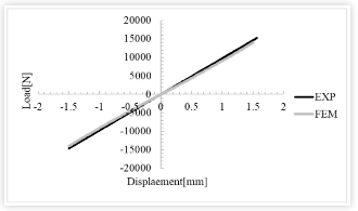 Die Buchsensteifigkeitskurve (Kraft-Weg-Kurve) wird mit experimentellen Ergebnissen verglichen, was die Gültigkeit des etablierten FEM-Modells weiter beweist. Wie aus der Abbildung ersichtlich ist, zeigt die Analyse mit hyperelastischen Parametern, die aus Materialtestproben ermittelt wurden, eine gute Übereinstimmung zwischen experimentellen und analytischen Ergebnissen im Last-Verschiebungs-Diagramm.