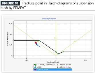 Das Haigh-Diagramm der Ermüdungssimulationsergebnisse für die Aufhängungsbuchse zeigt Bruch unter Druckspannungsverhältnissen. Obwohl Zug- und Druckbelastungen gleichermaßen auf das Gummimaterial einwirken, deutet die Analyse darauf hin, dass das Versagen letztendlich unter Druck entsteht.