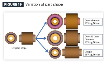[Etablierung eines effizienten Fahrzeugproduktdesignprozesses durch Ermüdungsanalysetechnologie] Unter Anwendung der vorgeschlagenen Ermüdungsanalysetechnik für schwingungsisolierende Gummikomponenten wurde eine parametrische Studie an Komponenten aus demselben Material durchgeführt, um die Beziehung zwischen geometrischer Variation (Gummivolumen) und Haltbarkeitsleistung zu untersuchen. Die Komponentengeometrie wurde aus dem ursprünglichen Teiledesign abgeleitet, mit modellierten Variationen, darunter: