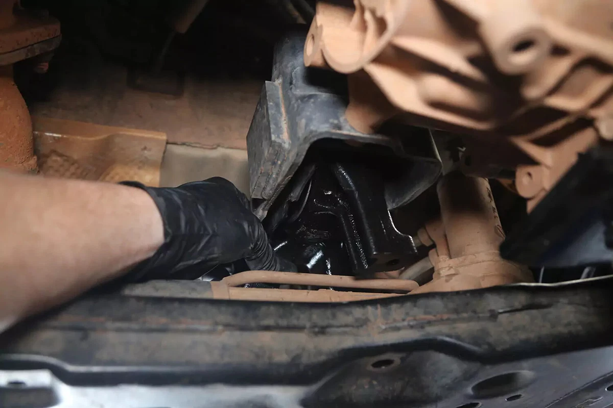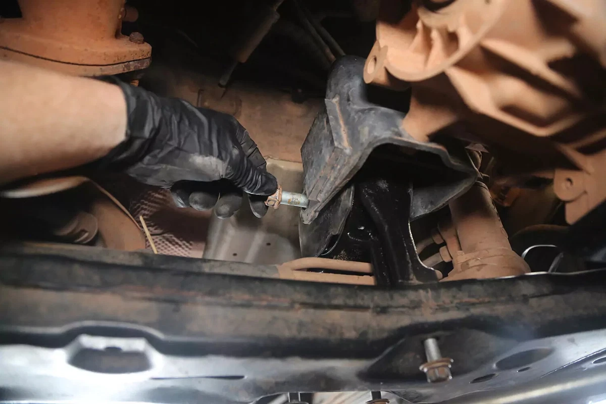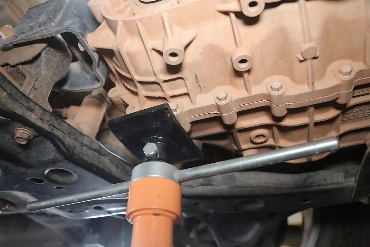 Entfernen Sie den Querbolzen. Entfernen Sie dann die Getriebebefestigungsschrauben vom Fahrgestell.