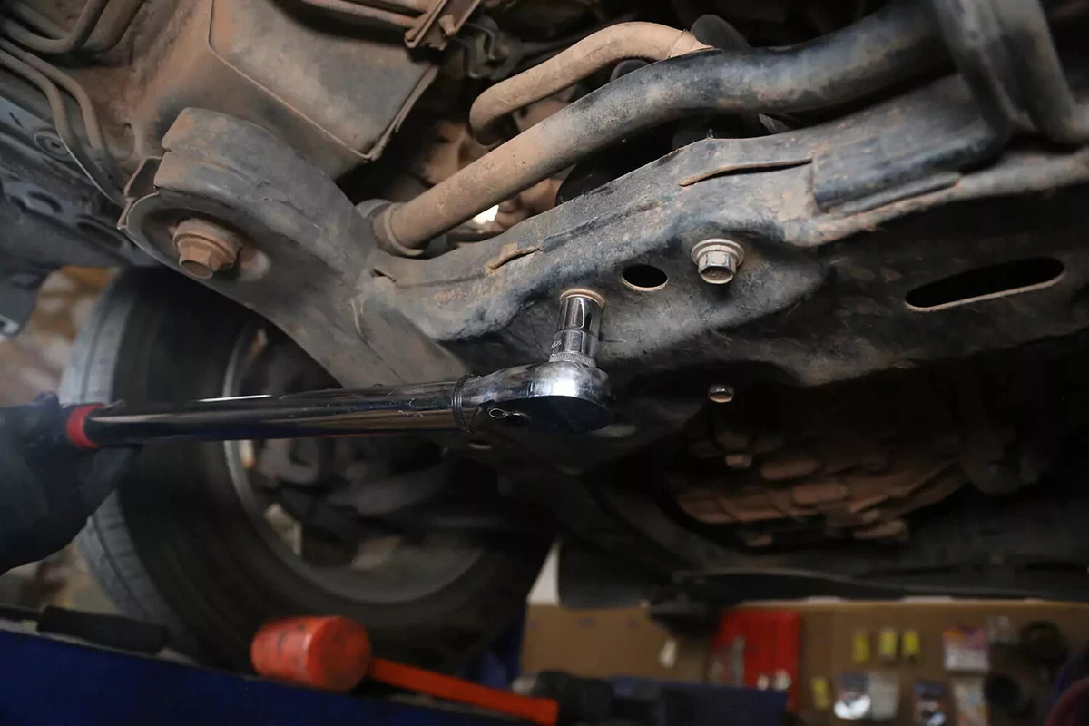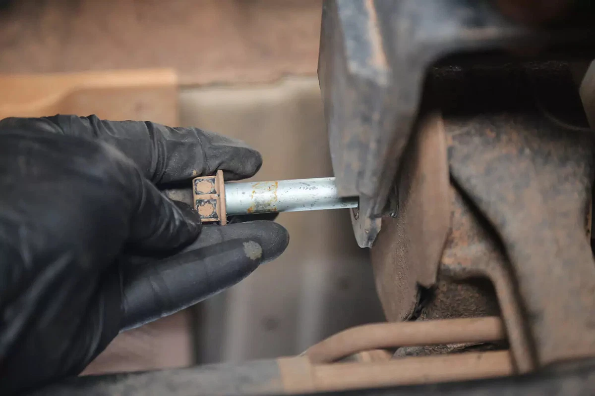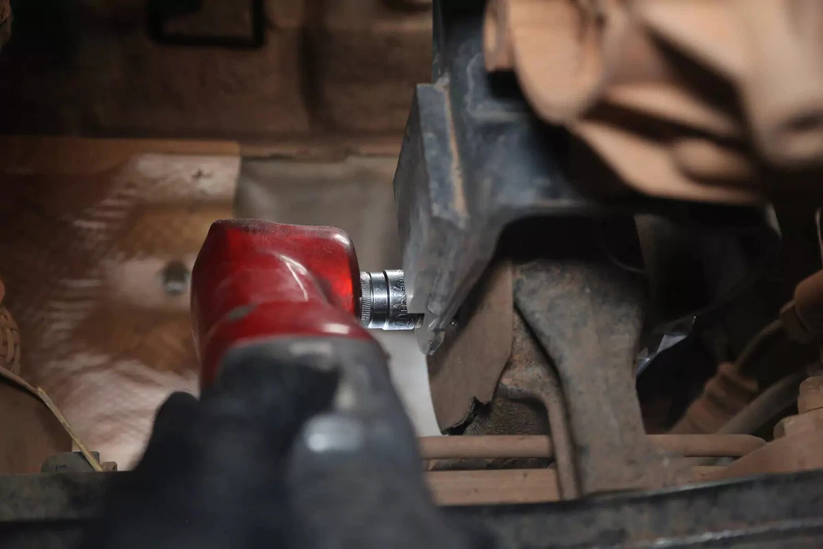 Unser Demofahrzeug verfügt über einen Querbolzen, der auf der einen Seite mit einem Schraubenschlüssel und auf der anderen Seite mit einem Steckschlüssel entfernt werden kann. In engen Räumen kann es schwierig sein, diese zu entfernen. Verwenden Sie eine Brechstange, einen Schlagschrauber oder eine Schlagstange, um die erforderliche Hebelwirkung zu erzielen.