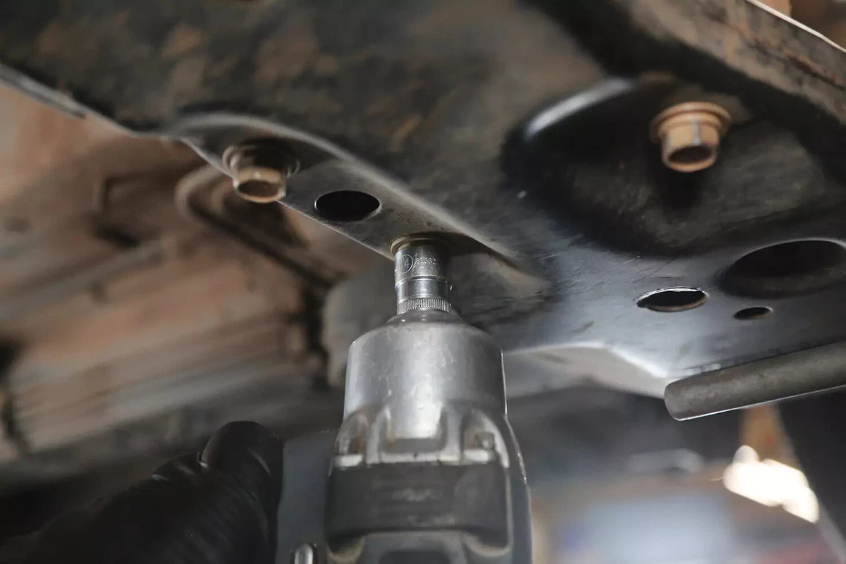Bei unserem Demofahrzeug verfügt die Halterung über drei Schrauben am Hilfsrahmen und eine Schraube am Getriebe. Vier weitere Schrauben befestigen die Getriebehalterung am Getriebe. Bei den meisten Fahrzeugen müssen diese nicht entfernt werden.